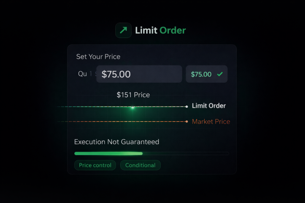 Allows you to set the price you are willing to buy or sell at. The order is only executed if the market reaches your chosen price. It provides price control but does not guarantee execution.
