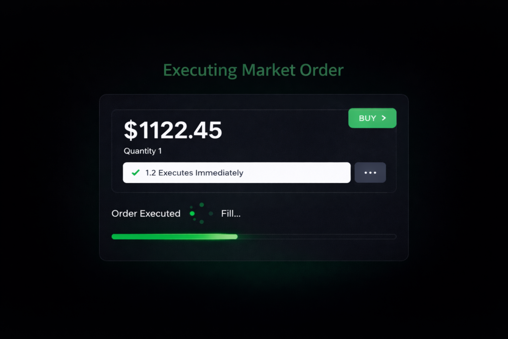 Executes immediately at the best available price. It guarantees execution but not the exact price.